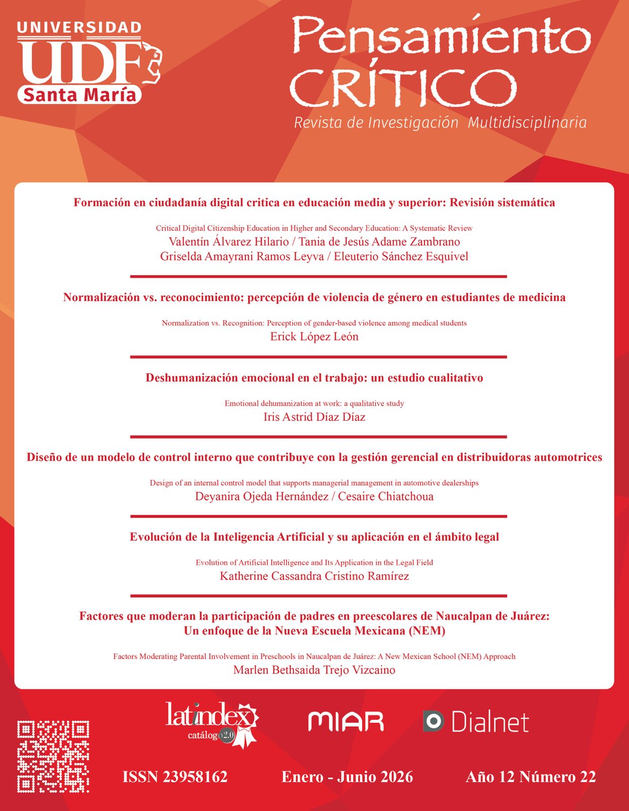 Pensamiento Crítico. Revista de Investigación Multidisciplinaria (ISSN 23958162) es una publicación semestral de la Universidad UDF, Santa María, la cual tiene por propósito ser un espacio que contribuya a la difusión de investigaciones originales que realicen aportaciones al desarrollo científico, tecnológico y social en las áreas de: 1) Administración y Finanzas; 2) Comunicación; 3) Derecho y Ciencias Jurídicas; 4) Economía; 5) Educación; 6) Organizaciones; 7) Psicología; 8) Sistemas; 9) Valuación; 10) Contaduría Pública; y 11) Comercio Internacional y Gestión Aduanera.