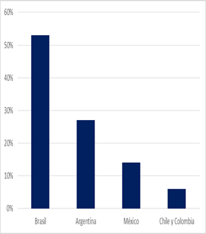 En América Latina, Brasil se califica como pionero en el uso del Comercio Electrónico con cerca del 53% de las ventas y la mayor penetración de internet en la región, Argentina con 27% y México con 14%, mientras que Chile y Colombia representan el 6% restante (Figura 1). Mercado pago cuenta ya con 52 millones de usuarios activos y un promedio de 8 pagos por usuario, ofreciendo pagos online y offline, y sus puntos de venta móvil, y pago con código QR, así como el Wallet Bancario con un crecimiento consolidado de 373% en el mismo año (Carrillo, 2020).