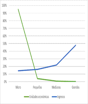 el sector privado … representado por 4,773,995 unidades económicas, 95% son micro, 4% pequeñas, 0.8% medianas, y 0.2% grandes. De esta misma fuente de información se extrae el total de los ingresos que generan las empresas y establecimientos del país, 14.2% fueron producidos por los micronegocios, 16.1% por los pequeños, 21.9% los negocios medianos y 47.8% por los grandes (p. 2).