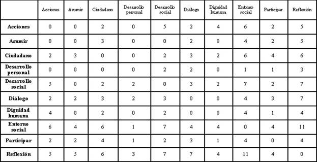 Por otra parte, en la Tabla 3, se indica la concurrencias entre categorías dentro del objeto de análisis, por lo que, coexisten entre 1 a 11 concurrencias en el análisis de Atlas.ti para las 10 categorías consideradas en esta investigación , en la que resaltan; 11 coocurrencias entre entorno social- reflexión; 7 concurrencias entre desarrollo social- reflexión, 7 concurrencias entre dialogo-reflexión; 6 concurrencias entre ciudadano-reflexión, 6 concurrencias entre acciones-entorno social, y por ultimo; 5 concurrencias entre acciones-desarrollo social, 5 concurrencias entre acciones-reflexión, 5 concurrencias entre asumir-reflexión.