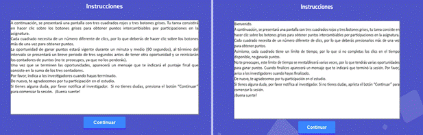 Antes de comenzar las sesiones experimentales, se entregaron los consentimientos informados a los participantes y se atendieron las dudas generales respecto de su participación, asà como de la manera en que podrÃan obtener los créditos. Una vez que se obtuvo el consentimiento firmado, se distribuyó de manera aleatoria a los participantes a uno de los grupos del estudio y se asignó una clave personal por participante. Al inicio de la sesión experimental, se escribió en el pizarrón la dirección de la página web por medio de la cual podÃan acceder a la tarea experimental y se instruyó a los participantes que ingresaran a la página mediante el navegador de sus Smartphones. Al ingresar, se presentó un menú con dos vÃnculos de acceso, uno para cada uno de los grupos del estudio. Con base en la clave personal del participante, se indicó a cada uno el vÃnculo al que debÃan acceder para continuar con la tarea experimental. Ambos vÃnculos redirigÃan a los participantes a la pantalla de instrucciones de la tarea (Figura 2). Para iniciar la tarea, los participantes debÃan pulsar el botón “continuar†ubicado en la zona inferior central de la pantalla.