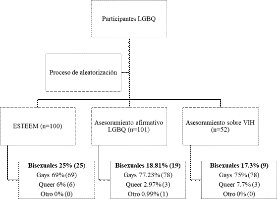 Nota. La figura muestra la distribución de participantes asignados a cada tipo de intervención psicológica (ESTEEM, asesoramiento afirmativo LGBQ y acompañamiento relacionado con VIH) en el estudio comparativo realizado con hombres jóvenes no heterosexuales. Adaptado de “Effective Skills to Empower Effective Men (ESTEEM): A cognitive–behavioral intervention for young sexual minority men”, por J. E. Pachankis et al. (2022), Journal of Consulting and Clinical Psychology, 90(5), pp. 401–415 (https:// doi.org/10.1037/ccp0000681).