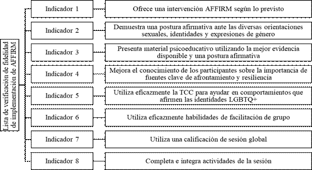 Nota: La figura presenta los ocho indicadores utilizados para evaluar la fidelidad de implementación de la intervención grupal AFFIRM desde un enfoque cognitivo conductual afirmativo, aplicada por profesionales de la psicología y el trabajo social en contextos clínicos con población LGBTQ+. Adaptado de “Evaluating implementation fidelity of AFFIRM: An affirmative cognitive–behavioral group intervention for LGBTQ+ youth and young adults”, por S. L. Craig et al. (2022), Journal of Gay & Lesbian Mental Health, 26(2), pp. 123–141 (https://doi.org/10.1080/19359705.2021.1993552).